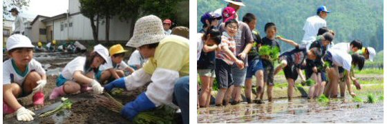 今年度も全校で花や農作物を育て「命」の大切さを学び、収穫の喜び(食育・キャリア教育)を味わい笑顔満開の学校にしょうと取り組んでいます。今年は、百四十周年を記念してPTAの協力のもと正面玄関に記念花壇を造園しました。 写真右:花植え、下左:サツマイモ植え、下右:田植え