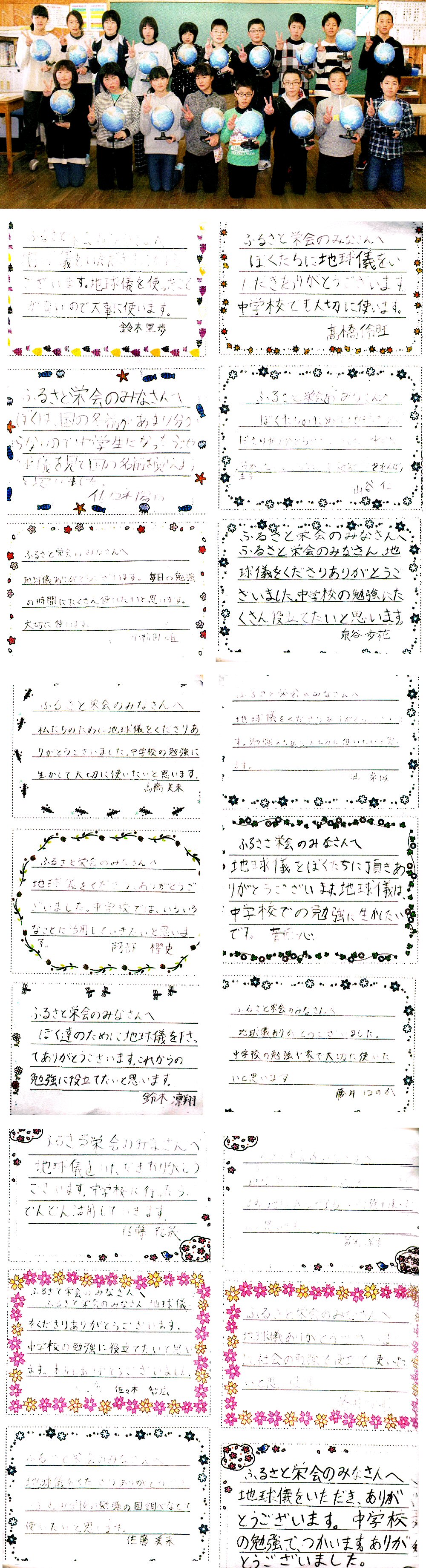 当日のプログラムの表紙を飾った栄小学校の子供たち(H29.3 地球儀を贈られた卒業生たち)。会場の壁に、子供たちから送られてきたメッセージも掲示された。